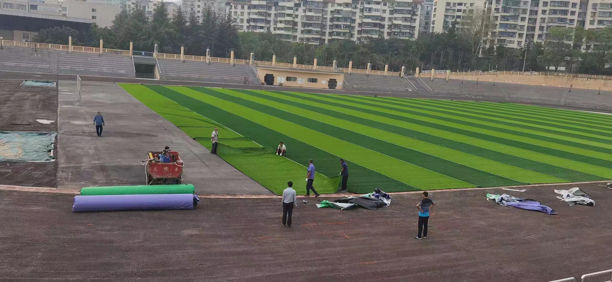 Fully automatic artificial turf sand filling and particle filling equipment, filling and carding are carried out at the same time, so as to minimize the wear of grass silk during construction.